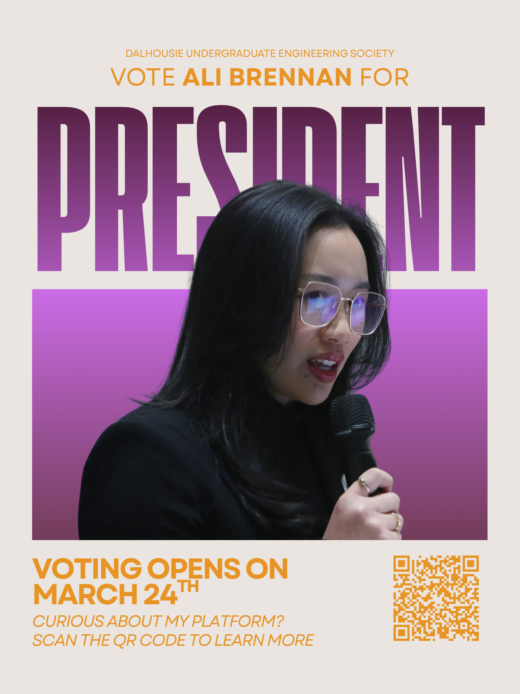 I am running for Vice President Outreach to strengthen Dalhousie Engineering’s professional engagement both within Atlantic Canada and across the country. Our Atlantic partnerships are foundational and valuable. If elected, I will work to deepen those relationships through structured collaboration and consistent communication. At the same time, I believe our outreach strategy should reflect the national competitiveness of our students. I will introduce a National Outreach Initiative targeting major Canadian engineering firms with Atlantic operations or national hiring programs. Through a new “Engineering Across Canada” series, students will gain access to virtual info sessions, alumni panels, and insights into engineering markets beyond our region. My focus will be on sustainable growth. That means building organized outreach systems, strengthening transition processes, and ensuring that professional relationships extend beyond a single executive term. Strong local roots. National reach. Meaningful opportunity.